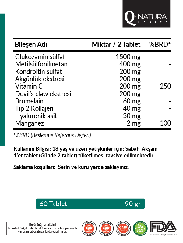 Glukozamin Tip 2 Kollajen 60 tablet (MSM,Kondroitin sülfat,Akgünlük ekstresi,Vit C,Şeytan Pençesi,Bromelain,Hyaluronik asit,Manganez)